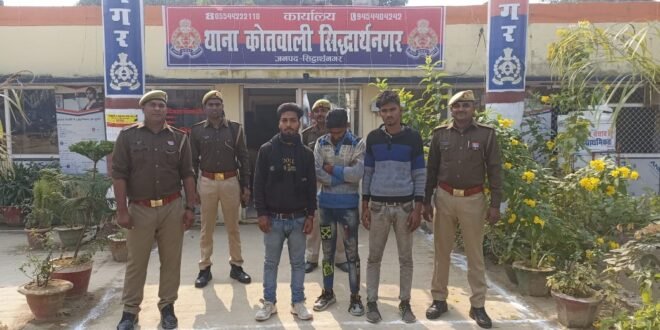 सिद्धार्थनगर(ब्यूरो)पुलिस अधीक्षक डॉ. यशवीर सिंह के आदेश अनुसार अपर पुलिस अधीक्षक सुरेश चंद्र रावत के कुशल पर्यवेक्षण तथा प्रदीप कुमार यादव, क्षेत्राधिकारी सदर के मार्गदर्शन में तीन व्यक्ति उस समय गिरफ्तार किये गए, जब वे ओवर ब्रिज भीमापार क्रासिंग के पास हाई वे पर ट्रक व बस चालकों को रोककर उन्हें उद्यापित करते हुए अवैध वसूली कर रहे थे। गिरफ्तार व्यक्तियों के कब्जे से अवैध वसूली के रुपये रू 1600/ तथा नगरपालिका परिषद नौगढ़ नाम से छापी गयी व्यतिक्रमित नम्बर्स की और बिना नम्बर्स की पर्चियां, जिस पर फर्जी हस्ताक्षर बने थे तथा कूटरचित और बिना वाहन नम्बर की कटी हुई पिले रंग की पर्चियां बरामद हुईं। इन अभियुक्तों द्वारा वाहन चालकों को भयभीत करके और फर्जी पर्ची के नाम पर हाईवे पर अवैध वसूली की जा रही थी। अभियुक्तों द्वारा कारित किए गए अपराध के आधार पर थाना सिद्धार्थनगर में अभियोग का पंजीकरण करके उन्हें माननीय न्यायालय के समक्ष पेश किया गया, जहां से उन्हें जेल भेज दिया गया।