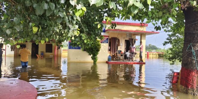 महराजगंज:- नेपाल के पहाड़ी इलाकों में पिछले दो दिनों से हो रही भारी बारिश का असर सीमावर्ती इलाकों में साफ दिखाई दे रहा है। निचलौल तहसील के ठूठीबारी क्षेत्र के लक्ष्मीपुर खुर्द गांव में चंदन और भौरहिया नदियों का पानी घुस गया है, जिससे गांव पूरी तरह जलमग्न हो गया है। गांव के घरों तक पानी पहुंचने से ग्रामीणों को भारी परेशानियों का सामना करना पड़ रहा है। बाढ़ का पानी लक्ष्मीपुर खुर्द पुलिस चौकी तक पहुंच गया है। चौकी परिसर में बने आवासों में पानी भरने से पुलिसकर्मी भी बेबस नजर आ रहे हैं। रसोईघर, हैंडपंप, वाहन, कुर्सियां, चारपाई और बिस्तर तक पानी में डूब गए हैं। गांव में स्थित सरकारी विद्यालय भी बाढ़ की चपेट में आ गया है। विद्यालय में पानी भर जाने से स्कूल बंद कर बच्चों को घर भेजना पड़ा। ग्रामीण बृहस्पति यादव के मुताबिक गांव के पूर्वी हिस्से में झारही नदी पर बना बांध करीब 200 मीटर टूट जाने के कारण बाढ़ का पानी तेजी से गांव में घुस गया।ग्रामीणों का कहना है कि बाढ़ से बच्चों की पढ़ाई बुरी तरह प्रभावित हो रही है। वहीं, लोगों की दैनिक दिनचर्या भी पूरी तरह अस्त-व्यस्त हो गई है।