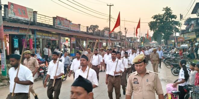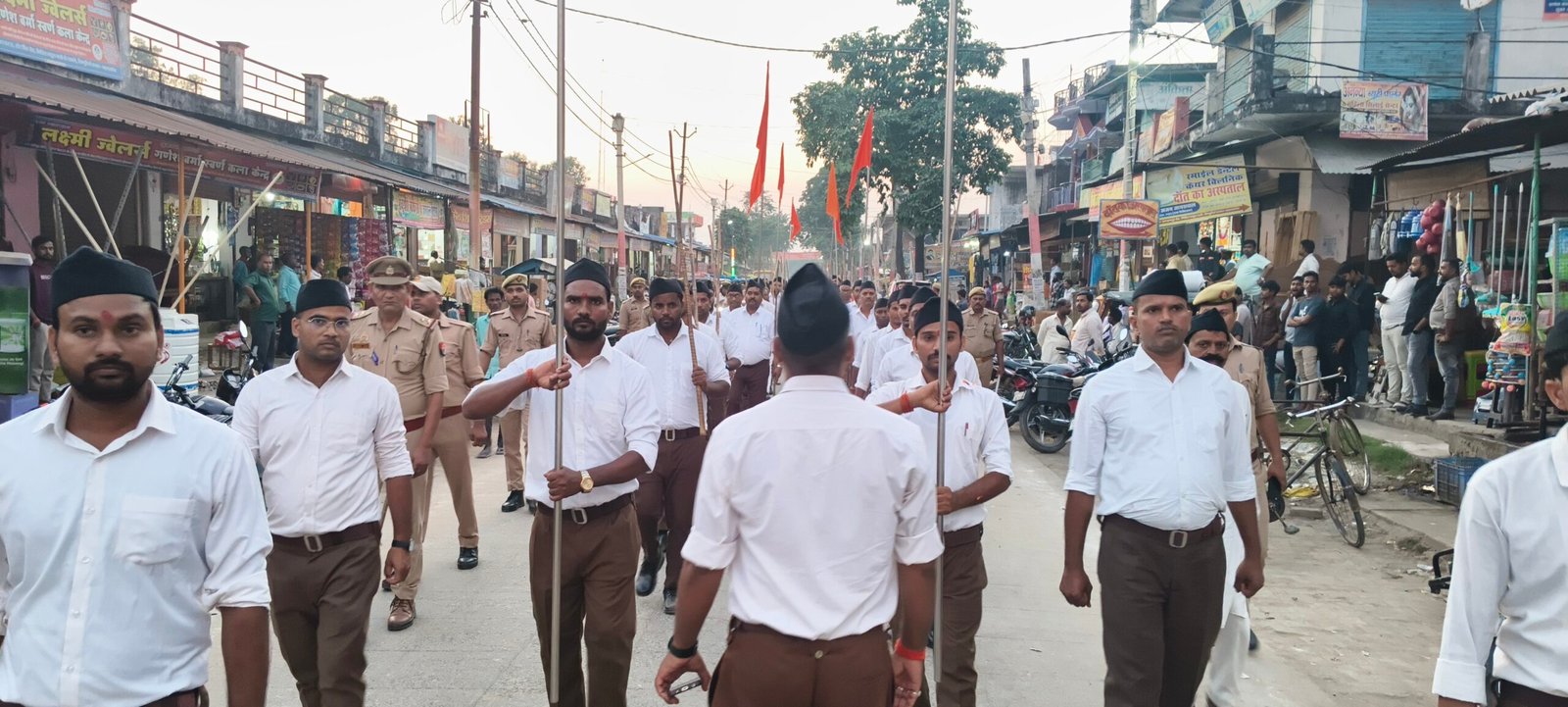 सिंदुरिया (महराजगंज)विजयदशमी पर्व के अवसर पर सोमवार को राष्ट्रीय स्वयंसेवक संघ (आरएसएस) की ओर से सिंदुरिया चौराहे पर भव्य पथ संचलन यात्रा का आयोजन किया गया। कार्यक्रम का उद्देश्य समाज में एकता, अनुशासन और राष्ट्रभक्ति की भावना को जागृत करना रहा।कार्यक्रम का शुभारंभ प्रातः 3 बजे स्थानीय शाखा प्रांगण से ध्वज वंदन के साथ हुआ। इसके बाद स्वयंसेवक पूर्ण गणवेश में बैंड-बाजे की धुन पर अनुशासित पंक्तियों में चलते हुए सिंदुरिया–निचलौल और सिंदुरिया–महराजगंज मार्ग से होकर निकले। संचलन के दौरान ग्रामीणों ने पुष्प वर्षा कर स्वयंसेवकों का स्वागत किया। ग्रामीणों में कार्यक्रम को लेकर विशेष उत्साह देखा गया।मार्च के समापन के बाद विद्यालय परिसर में सभा आयोजित की गई, जिसे संबोधित करते हुए संघ के प्रमुख वक्ता संतोष गुप्त ने कहा कि “विजयदशमी का पर्व असत्य पर सत्य और अधर्म पर धर्म की विजय का प्रतीक है। संघ का उद्देश्य राष्ट्र को सशक्त और संगठित बनाना है।”सभा में वक्ताओं ने समाज सेवा, अनुशासन और राष्ट्र निर्माण में स्वयंसेवकों की भूमिका पर जोर दिया। इस अवसर पर बड़ी संख्या में स्वयंसेवक उपस्थित रहे, जिन्होंने समर्पण और संगठन के भाव के साथ राष्ट्र सेवा का संकल्प दोहराया।कार्यक्रम के दौरान सुरक्षा की दृष्टि से पुलिस प्रशासन द्वारा पुख्ता इंतजाम किए गए थे। पीएसी, फायर ब्रिगेड और थाना चौक पुलिस के जवान